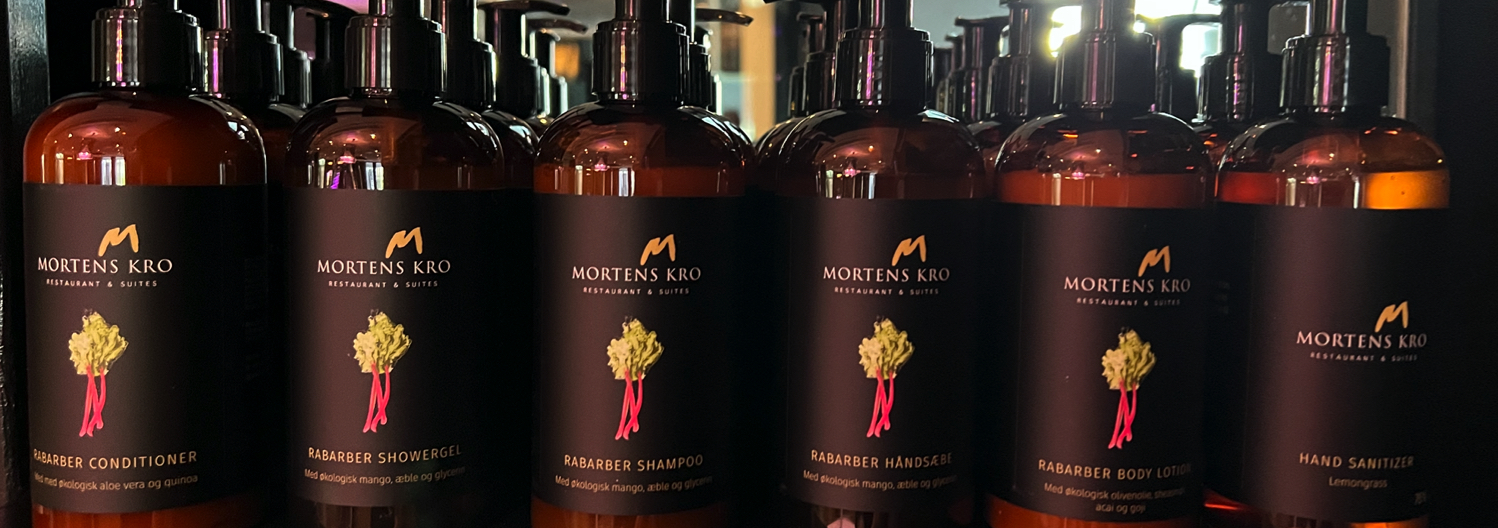Mortens kro's unique care products with rhubarb, which are vegan and organic, as well as our wonderful hand sanitizer with lemongrass.